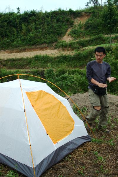 >天色渐渐变暗,大伙儿在寺院前的一块农田上搭帐篷,位置处于田野中,晚上可以听取蛙声一片,只是小虫子太多.</P>