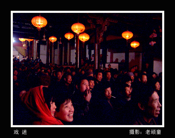 拍这种题材作品实在太难.假如把戏台拍进去,因戏台灯光比较亮,台下灯光暗,测光点就难以把握,要么曝光过度,要么曝光不足.我们一起去拍的几位摄影高手都遇到了这个问题. |
