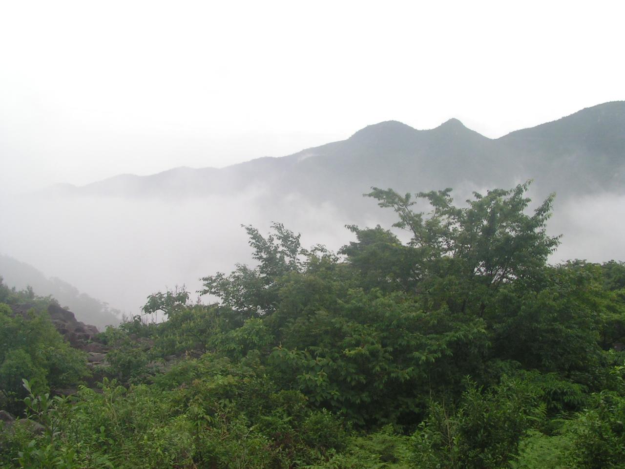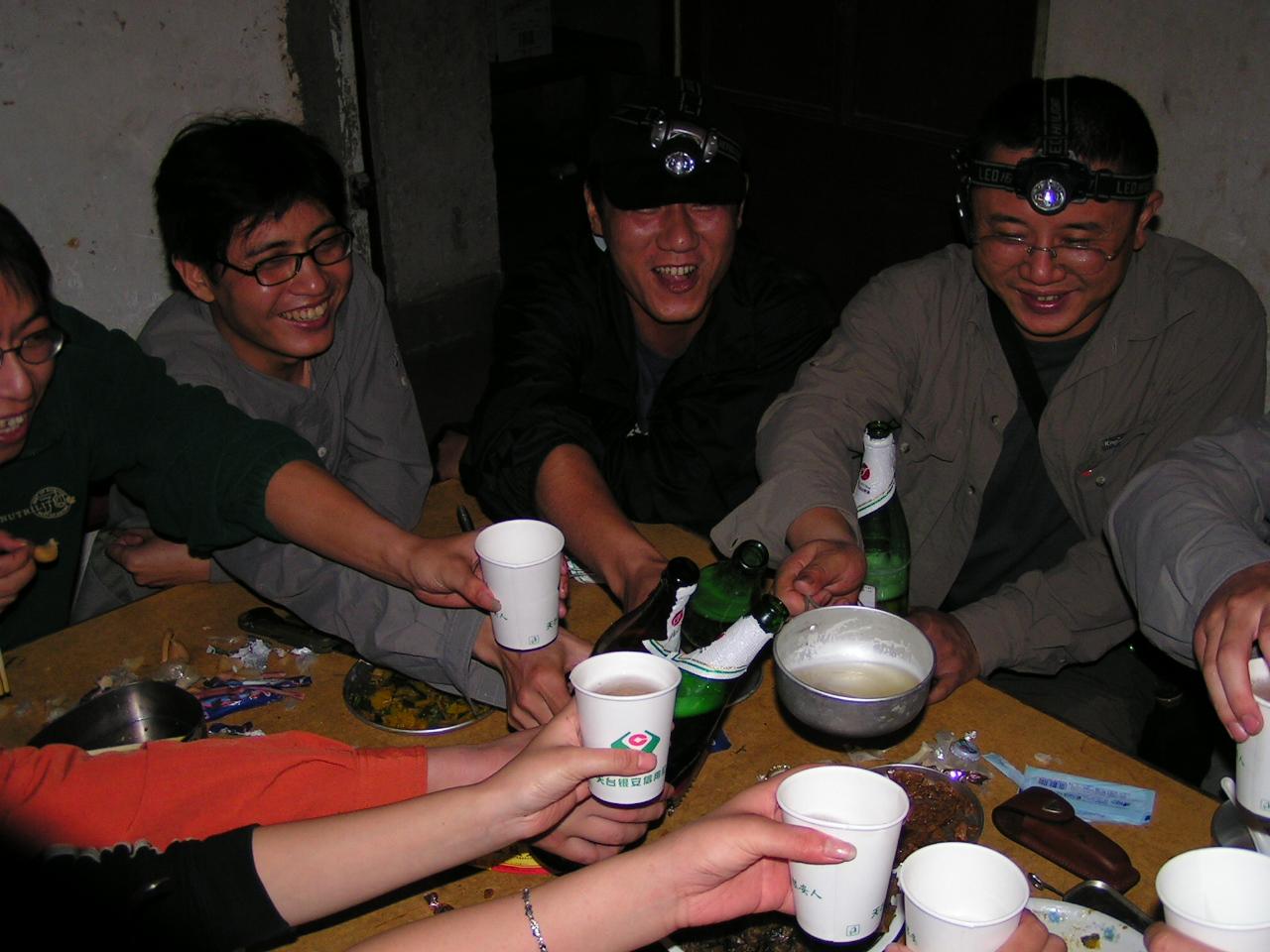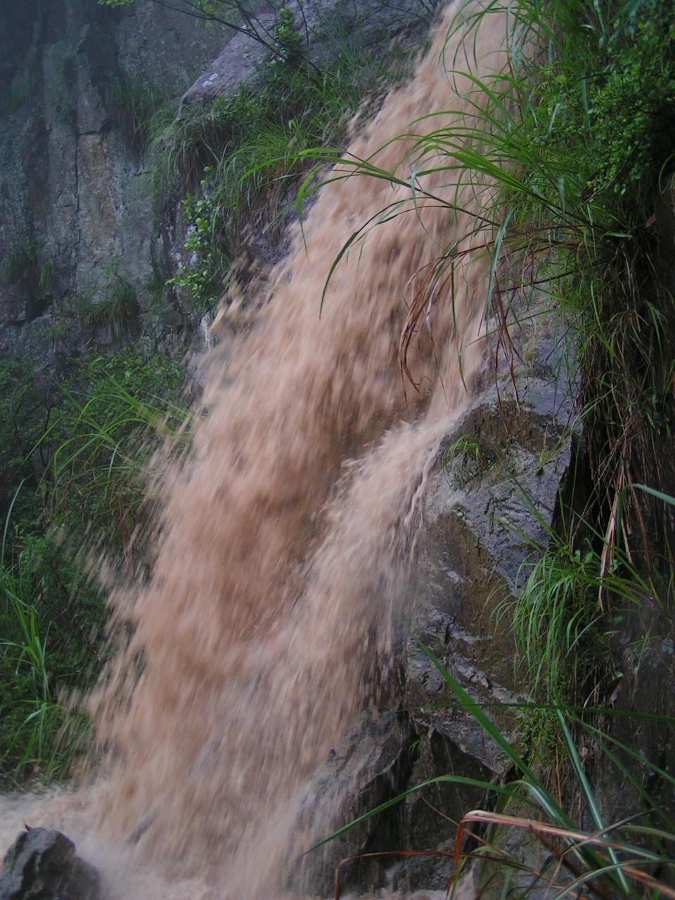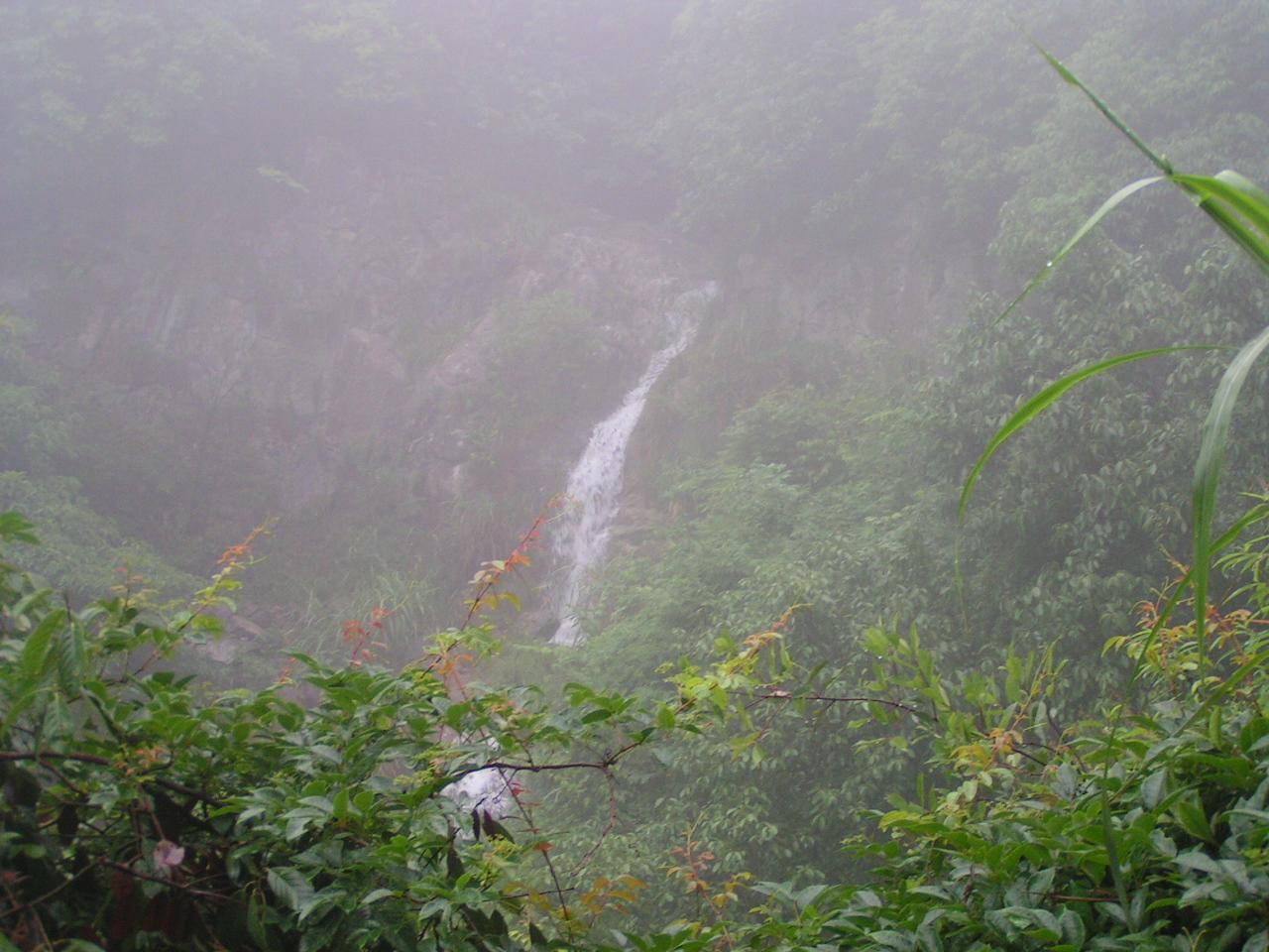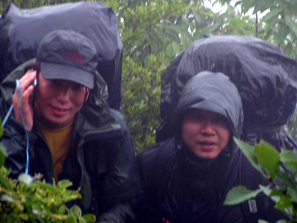 < > 在互相帮助下渡过那个瀑布后,顺着山路没多久就发现已到悬崖尽头,这时退回已经是不可能了,只能向上爬。在这里应该感谢我的二个表弟,是他们帮我背起我的登山包,山很陡,林很密,只能一步步的扶着树枝走,到一个平台全体休息的时候,发现已经无路可走。试着向上开出一条路来却发现这真的太难了,大陆说上来的时候依稀看到左边有一条横路,等我去找的时候却什么也没有找到,只好横切一会后再顺着山势向上爬,看到有几棵以前被砍到放在一起的树枝的时候,心里就别提多开心了,立马通知大部队告诉他们这个好消息,可是再向上穿几米就傻眼了,我已经面对着苍山顶,但前面就一悬崖,只好黪然下撤,却已经找不到我爬上来的路了,喊着他们,顺着声音就直接穿下来。