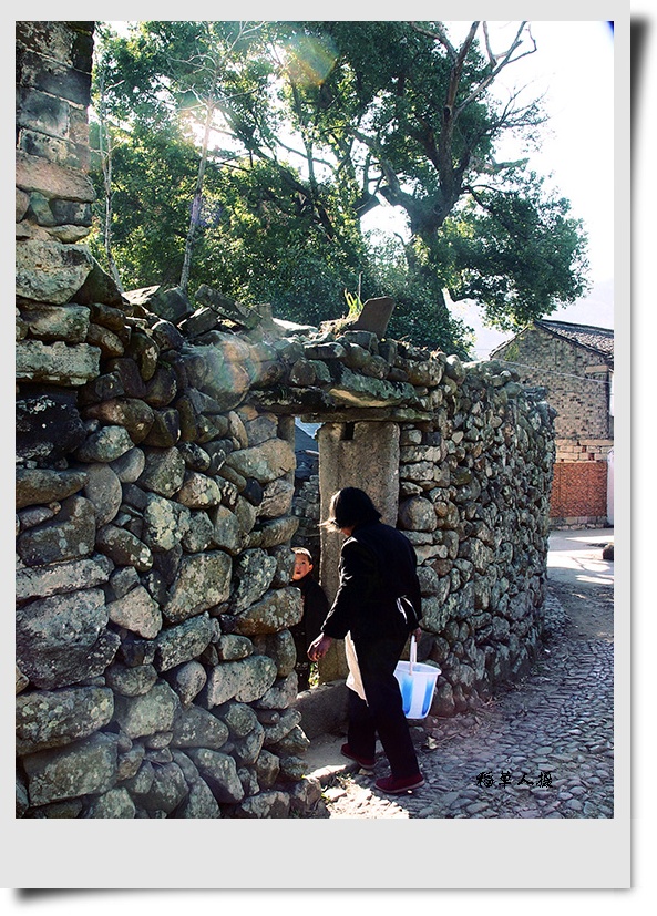 瓦顶,飞檐,石墙,石子路。