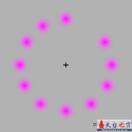 一定要聚精会神地盯着中央的十字看, 你会发现,周围紫色的圆点渐渐淡下来,甚至消失。 最后只剩下一个绿色的圆点在那里转! 很神奇``` <!---->